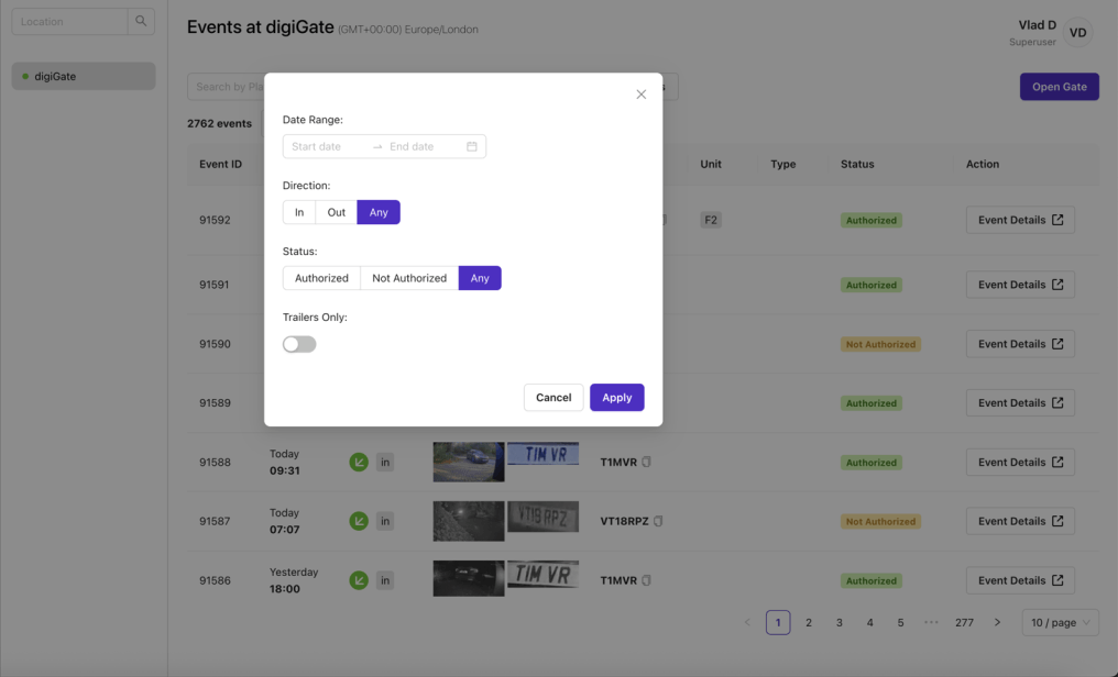 Complete photo and timestamp logs of every gate event for security and compliance.