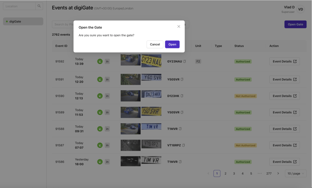 All vehicle passages are recorded with time, photo proof of entry, plate, and direction. Review them anytime in your secure dashboard.